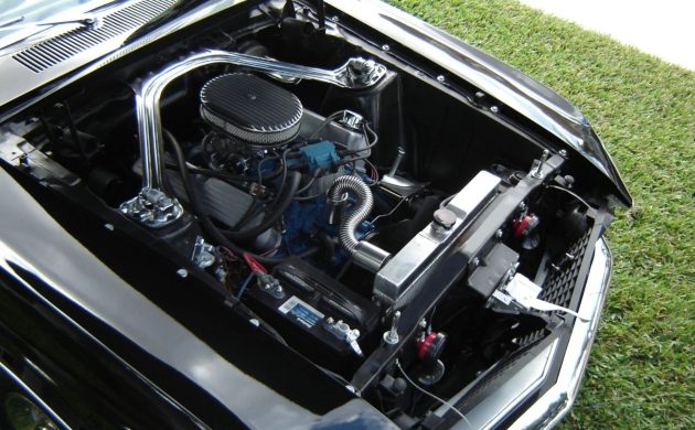 Under the hood, the engine compartment has been detailed and updated with a new aluminum radiator, battery and cables, 4-barrel carburetor, aluminum air cleaner, windshield washer bottle and kit, belts, spark plugs, and plug wires. The power steering and power brake systems are described as new, along with the disc brake setup.