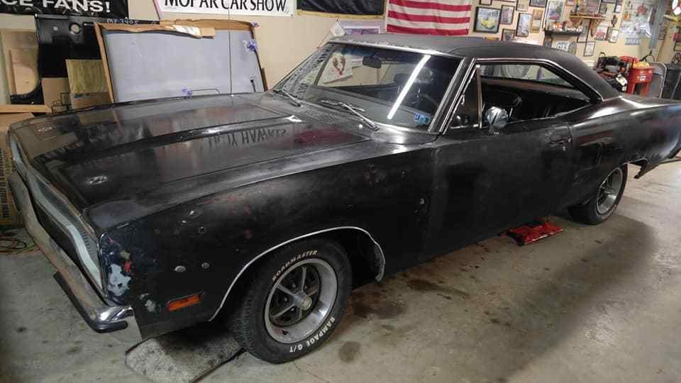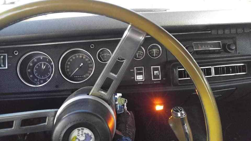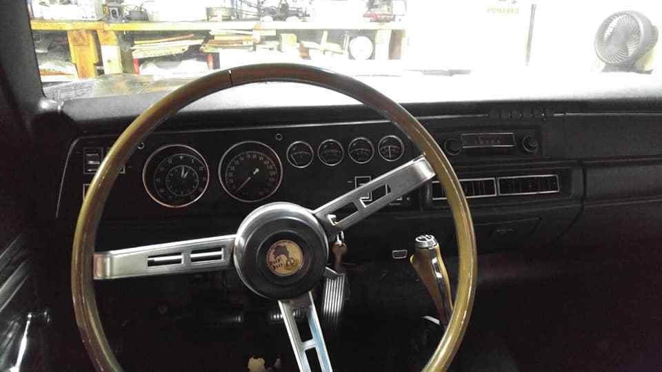 The interior of the Road Runner appears to be in pretty good condition. The dash is complete and doesn’t appear to have been modified in any way. The pad looks like it could be crack-free, although there is a crack visible in the wheel rim. The black seats look like they are okay, but we don’t get a look at the door trims or headliner. The owner is also including new carpet with the car.