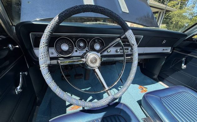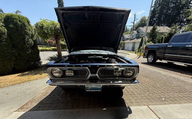 Inside, the triple blue color theme continues, and though the interior isn’t fully restored, it’s original and presentable. Most of the glass is factory original as well, with only the windshield having been replaced. This Barracuda is described as a lifelong Northwest car and comes with a collection of service receipts.