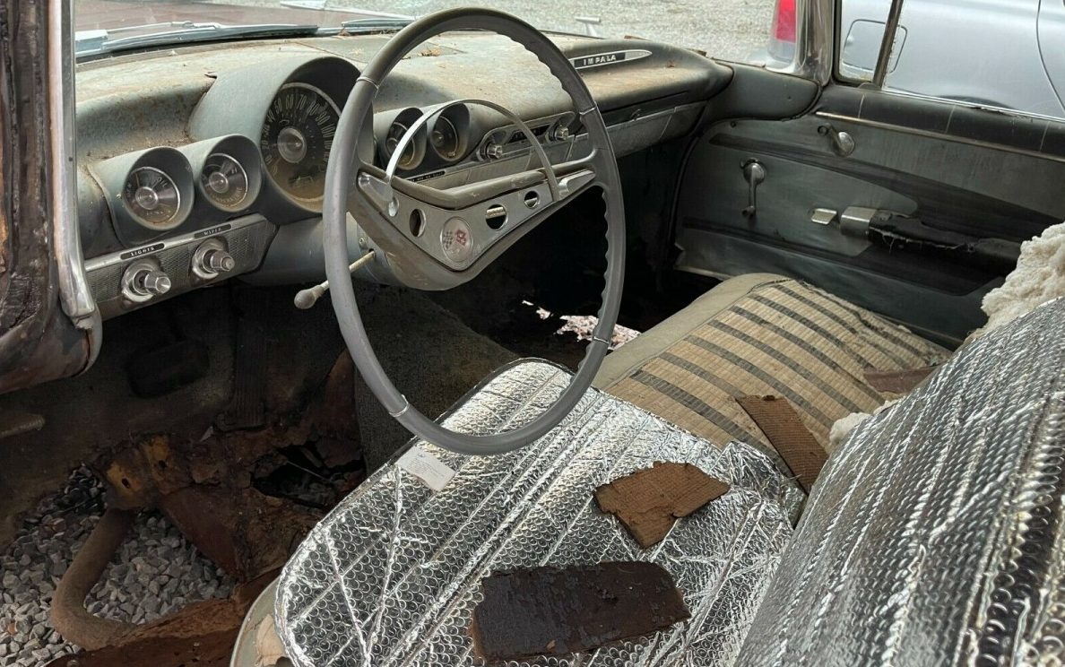 Known as a “flat-top” thanks to the shape and size of the plateau-sized roof, this Chevy is still wearing its “love them or hate them” distinctive bat wing tail fins. The body is a bit banged up, it has some rusty rockers, missing trim, plenty of surface rust abounding, and some cracked glass. The seller mentions, “I have 2 nice front doors in my RENO Cadillac yard, I can help you with these let’s talk“. Well, that’s nice except that they’re sedan doors, not hardtop doors and simply sawing off the window frames isn’t going to cut it. All’s not lost however as the buyer will get at least one Oldsmobile rally wheel.
