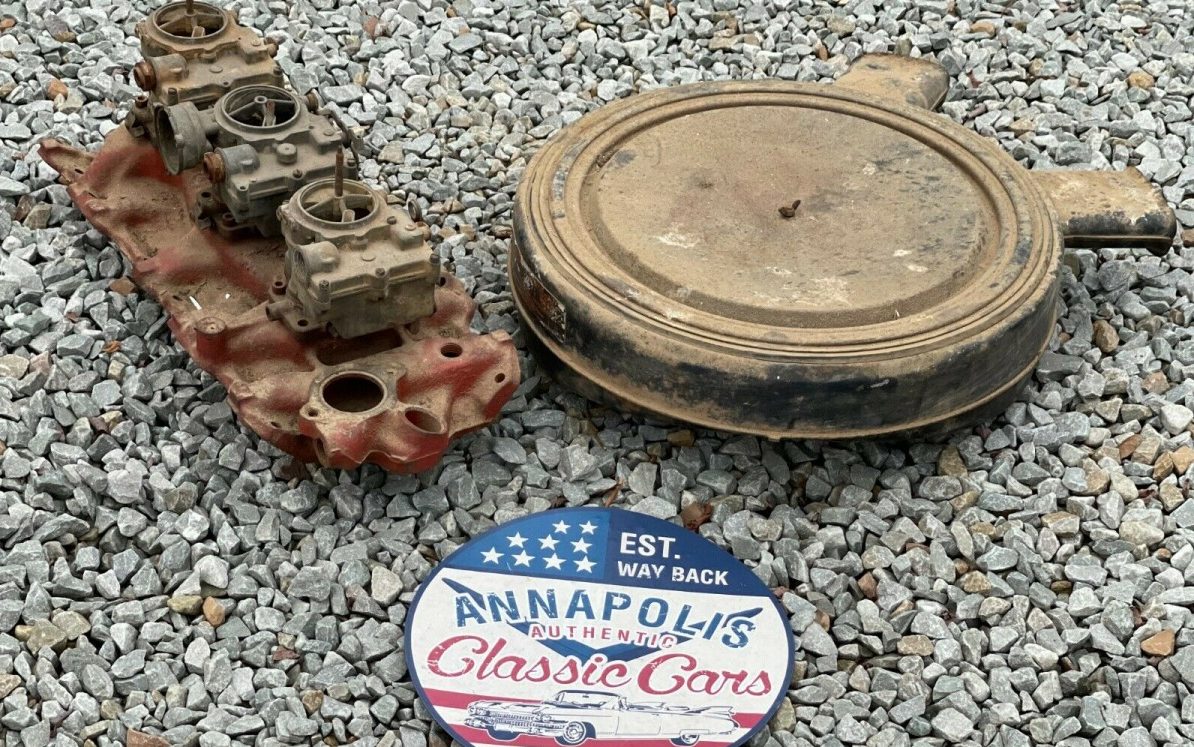 Car is almost too rusty to fix. The three duece setup is also a joke, those are not tripower carbs which are different. This is the usual trick, find an intake and throw any three old 2GC Rochester’s on it, and most people won’t find out till after they bought it the end carbs are completely different and the center one mostly different. At least it has the air cleaner that’s the best piece from the whole car. Pass…cool but not worth the effort.