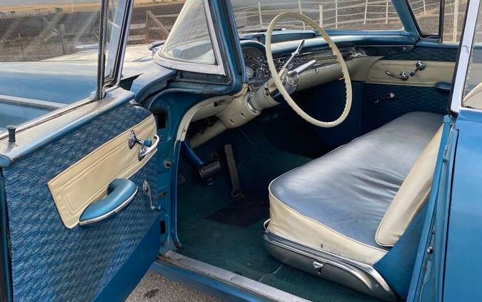 Nestled among all of that chrome trim is a 312 gross HP, 394 CI “J2” V8 engine, a two-year option (’57-’58) that only resulted, according to Hotcars.com, in 2,500 copies being produced. The seller states, “Optional J-2 engine runs very well! Great cruiser driver. Carbs rebuilt a few years ago and linkage changed to progressive; (the) engine has never been removed and has some minor leaks from age“. Two transmission choices were available with the J2 engine, a three-speed manual, or a four-speed Hydramatic automatic such as is found in this 82K mile example.