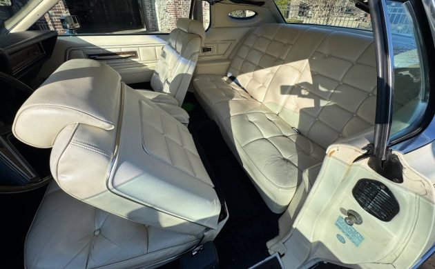 Inside is about what you’d expect in a car of this stature – white leather upholstery. From what can be seen, it looks good. The mileage reading is 35K miles, and while there’s no claim to that recording, the driver’s seat shows a bit more wear than the passenger side, but that’s to be expected. The exceedingly wide dash has its share of faux wood trim, but that too is to be expected. The great plain’s sized dash top is unmolested, and the door panels do not indicate permanent elbow indentations or ground-in grip grime. Speaking of the doors, note how the ashtray for back seat passengers is in the rear edge of the door’s armrest. The doors on this baby are so long, I’m surprised Lincoln engineers didn’t consider hanging these things with three hinges instead of only two.