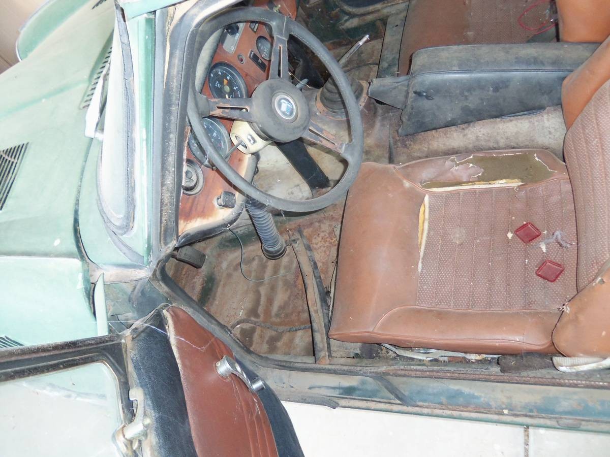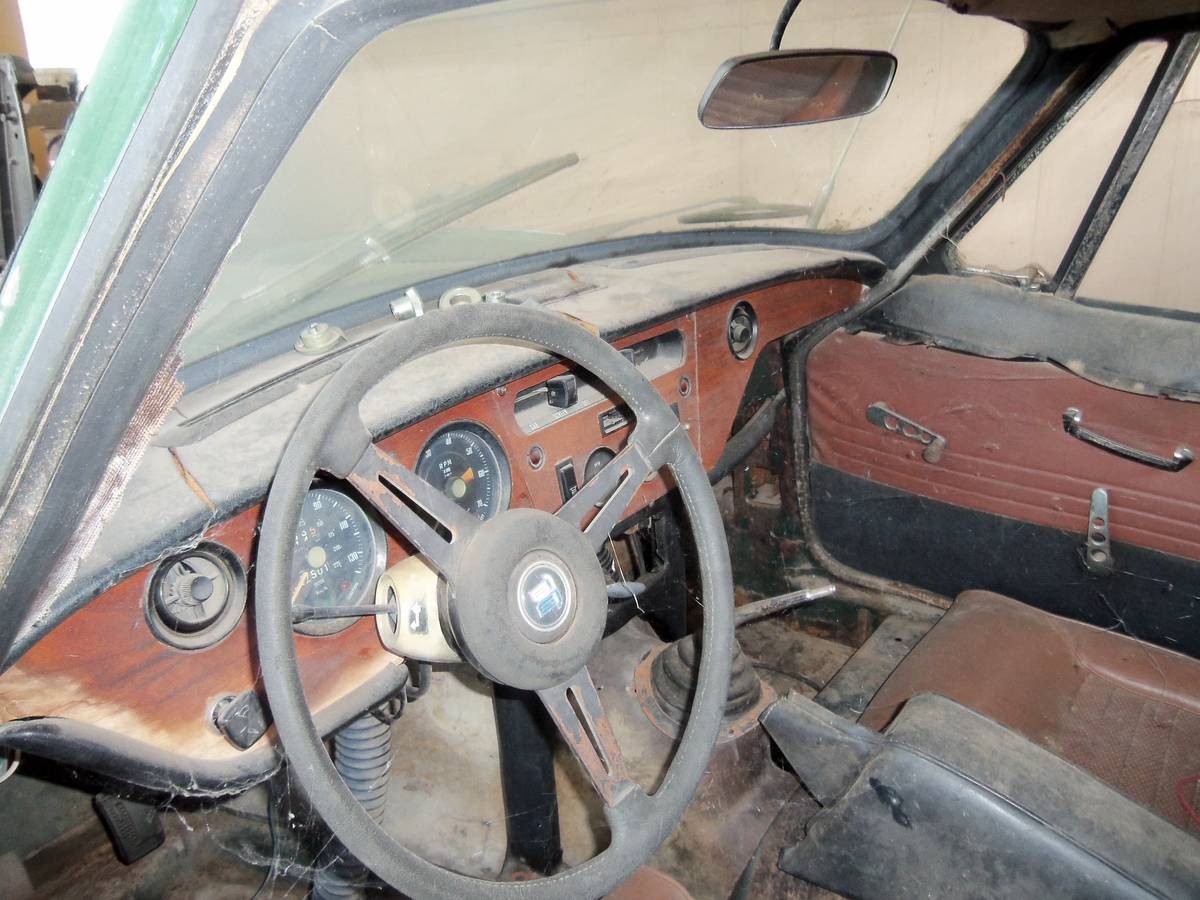 Not only is this a GT6, it’s the “Plus” version offered from 1968-70 that is generally considered to be the best of the best! The GT6 was created to combat the MGB-GT, itself an underappreciated coupe, but offered 6 rather than four cylinders, fully independent suspension (more about that later), fantastic underhood access (that whole bonnet you see tilts up to the front) and a much nicer interior than the Spitfire it was based on. Those are even the original wheel covers in this picture which bodes well for how this car may have been left alone. Don’t worry about that front caution light being missing either; they are available brand new.