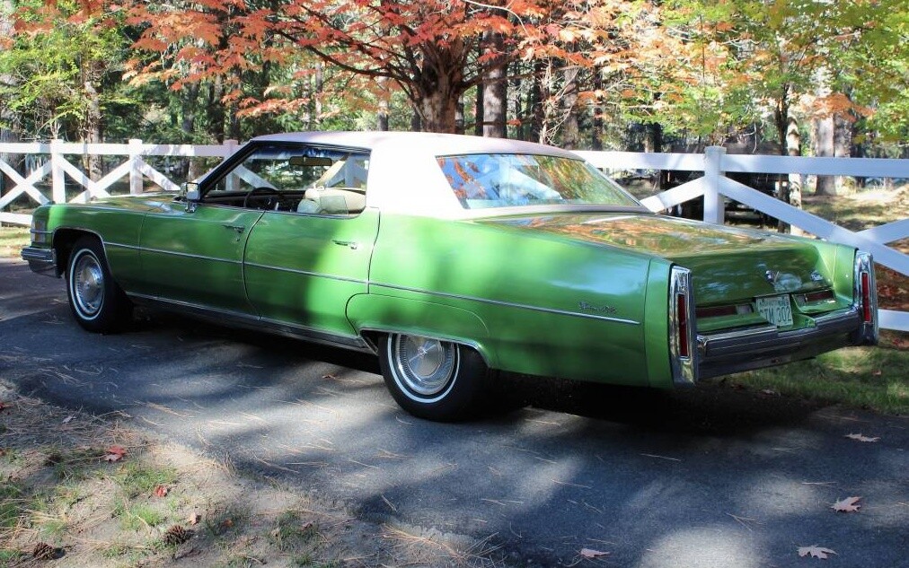 I looked up the 1974 Cadillac color chart. There is a color called Terra Cotta Firemist Metallic, looks like the Furious Fuscia Chrysler put on 400 Challengers in 2010 ONLY. In 1974, I was 18 and pumping gas at a very busy Exxon in my hometown, where I still live. A local woman, Sandy, good looking, came in about 3 times a week for gas as her 74 Cad Coupe deVille ate it like candy. She had a charge account, just signed her name on those old paper credit cards slips and drove away. The car had white leather and a half white vinyl top. I never saw that color ever again on any car. This green one is a beauty, but if you’re gonna drive it, you better own a gas station. They got 10 mpg at best.