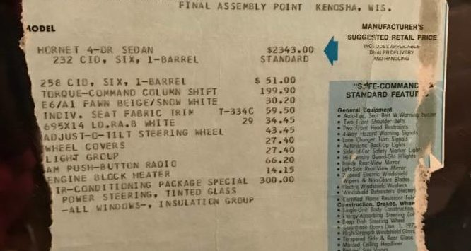I like the Hornet, interesting design…now, but back in the seventies it was just and only just another lowly transportation car. Take a look at the cost for AC, no other option comes close in price. Wow!