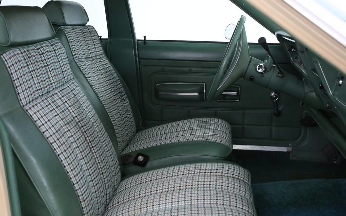The interior is way cool, green! No one does green interiors anymore. There is nary a scuff mark, stain, loose thread, you name it. It looks like this Hornet just left the new car get ready department. The seat fabric’s houndstooth pattern is the ’70s all the way and is a nice diversion to the bland, blander and blandest interior fabrics and hues that are so prevalent in modern cars.