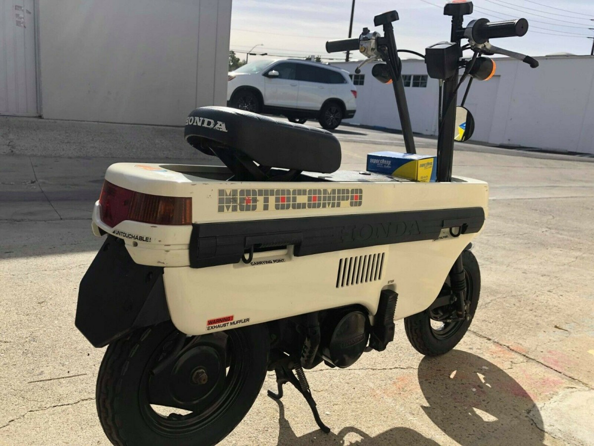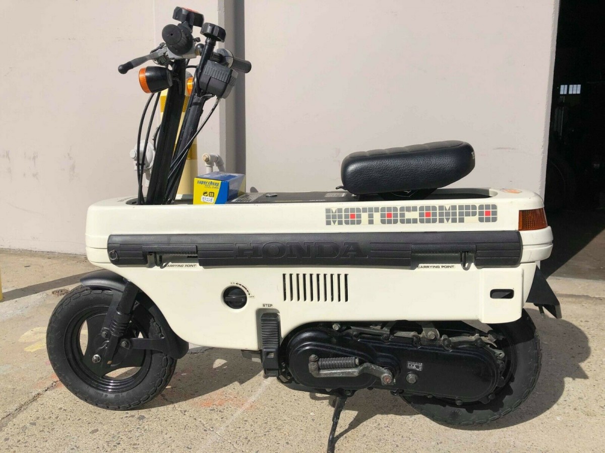 The Honda Motocompo was designed and sold in Japan from 1981 to 1983 as an accessory option for the Japan-spec City and Today compact car models. Honda designed the cargo compartment of the cars specifically to be able to fit these in there. About 53,000 Motocompo were made, however neither those cars nor this cycle were ever offered in the States. It’s likely that more of these bikes have survived than any of the passenger cars.