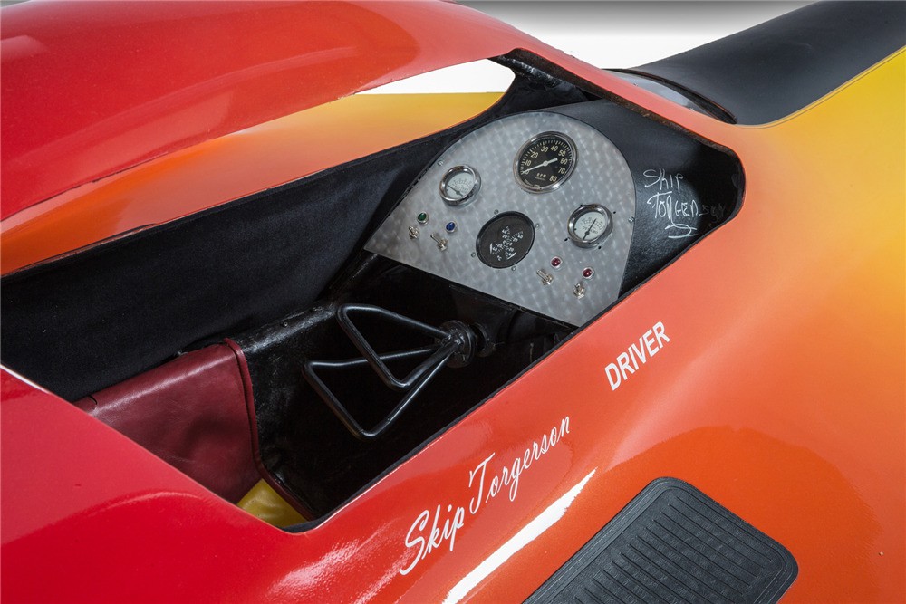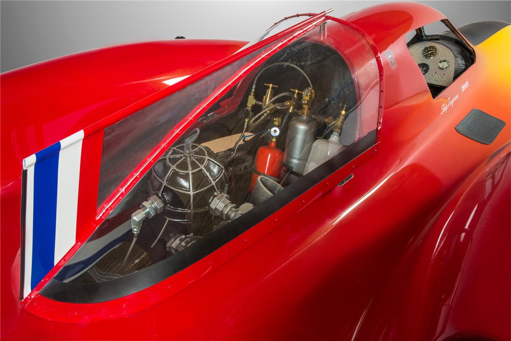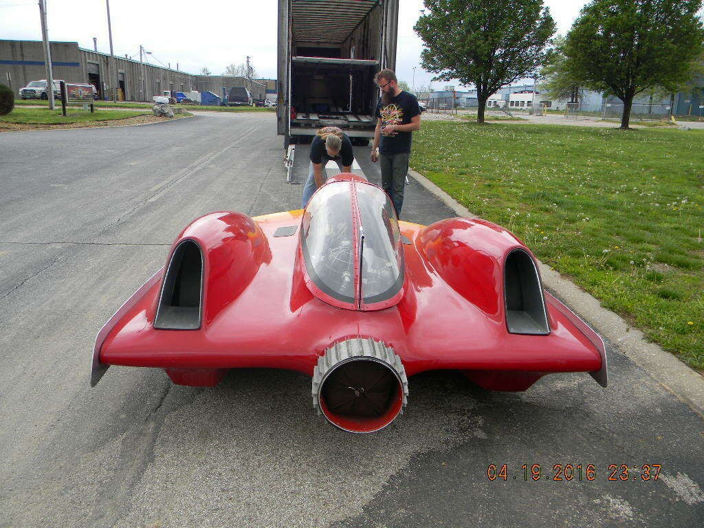 Engine operates through a v-drive gear reduction unit and directly into a reversed ring and pinion rear end which drives each wheel independently turning 92,000 revolutions per minute and reduced 16 to 1 developing 8,000 revolutions per minute at the wheels. For stopping the vehicle, a combination of an offset blown parachute plus four stabilizer wing flaps are used, and for low speed stopping are Airheart spot disc brakes. To finish off this ultra sonic design, the color is 40 coats of transformation in a turbine fire effect flame of pearl and fire frost flakes from a white pearl nose into a translucent yellow into an after-burning orange finishing off into fire red.”