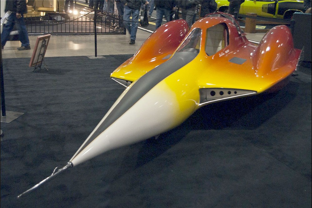 ...The Turbo-Sonic was designed as the 25th century three-wheel racing car to develop speeds of 300 mph in a quarter mile racing strip powered by a 50 pound fuel burning turbine engine that can reach 1,000 horsepower.