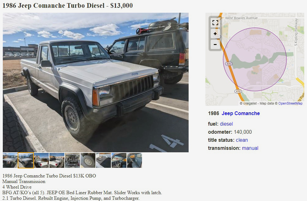 I have a thing for 1986 Jeep Comanches. We’ve seen three of them on Barn Finds, and I wrote up each one. This 1986 Jeep Comanche X 4×4 diesel is my favorite of the bunch by far, and this one takes it to #11 as it’s a 4×4, 5-speed, and is powered by a turbo-diesel engine made by Renault, AMC’s partner in this era. The seller has it posted here on craigslist, southwest of Denver, and they’re asking $13,000 or offer. Here is the original listing, and thanks to Mike F. for the tip!