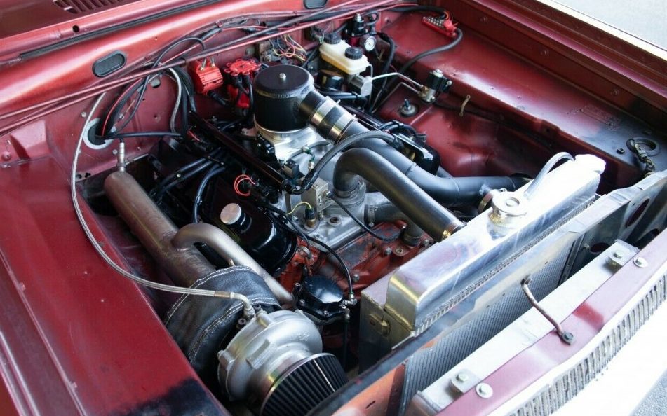 New front seat upholstery looks perfect with the mostly-stock interior. The no-nonsense rubber-booted floor shifter stirs a classic A-833 four-speed manual. The durable Dodge 8 3/4″ differential houses 3.23 cogs with Sure Grip limited-slip to transmit the boosted V8’s power to the ground via both rear wheels. A leather-wrapped steering wheel and aftermarket tachometer suit the performance nature of this deadly Dart without giving too much away in traffic. Turbos tend to quiet the exhaust which also helps maintain the sleeper persona. Would you suspect an EFI turbo V8 powers this once-dowdy Dart?