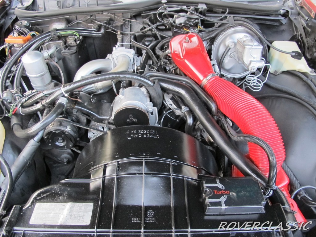 Here is a picture of the 231 cubic inch (3.8 liter) turbocharged V-6 engine. The turbocharged engine was designed to provide additional power on demand. Under normal conditions, the car performed like a regular V-6, but as speed and load increased, the turbocharger cut in to supply additional power. The car has 38,386 miles on the odometer.