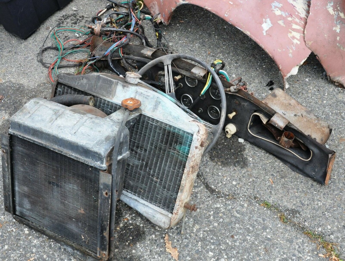 So then the question becomes: could you built a competent race car out of the parts available through this listing? The seller notes that there’s not quite enough to build one entire car, but it’s close. Some of the major systems noted as having “most but not all” of the necessary parts include the front suspension, brake system, and wiring harness. The lot includes a disassembled 950 BMC A series engine and a complete and assembled BMC A-series 4-speed synchro rib case transmission. As you can see here, a dash with gauges and a radiator is also included, but all parts will likely need to be rebuilt or restored.