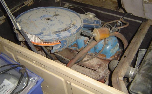 These wagons were powered by six-cylinder engines, and – in 1964 – a 170 cubic inch 6-banger was used. A 240 truck I-6 was optional. The dusty air cleaner here may have a 200 label on it, so perhaps the engine is not original. Whatever the case, this van doesn’t run thanks to a lifter that’s “not pumped up.” A 3-speed manual transmission was/is the typical companion to the six-cylinder motor.