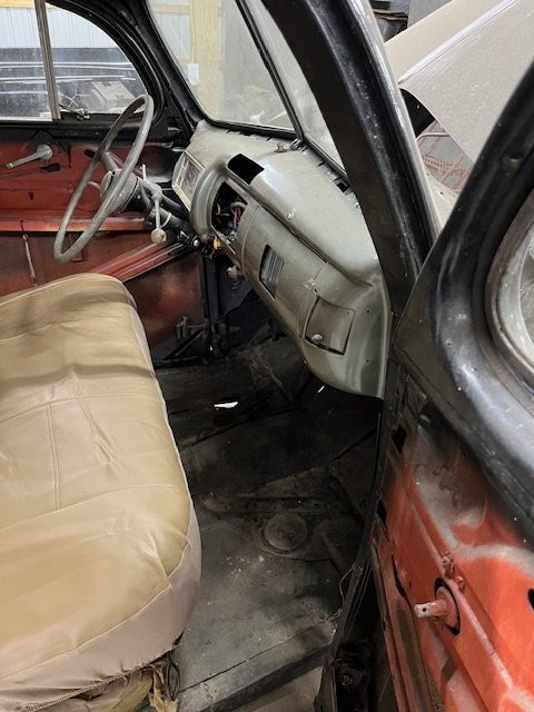 The picture above shows substandard floor repair in faint detail. We can also see that the door panels and the rubber floor mat are missing. The radio is also gone from the dash. That may be a difficult item to find. Also absent is the optional clock that fits perfectly in that hole in the glove box door. The clock I assure you will not be cheap to replace. Hopefully, the seller has it.