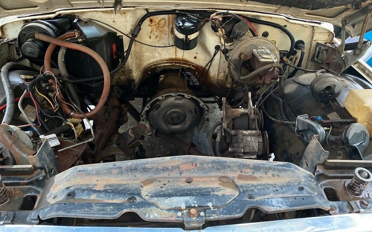 This Cherokee’s biggest drawback is its engine, it doesn’t have one. Decoding the VIN indicates that it was originally equipped with a 175 net HP, 360 CI, AMC V8 engine. Gear changing occurs courtesy of a GM Turbo-Hydramatic, three-speed automatic transmission, still in place, working in concert with Jeep’s Quadra Trac four-wheel-drive arrangement. The GM transmission must have incorporated an AMC-specific bolt pattern as the one installed doesn’t look like that utilized by Chevrolet or BOP. The seller states, “Engine froze several years ago, was removed and was going to get a swap but never got around to it“.