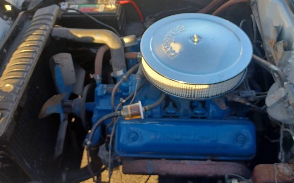 Under the reverse opening hood is a 200-gross HP 292 CI “Y-Block” V8 engine attached to a “Fordomatic” automatic transmission. Other than the open-element air cleaner, an aluminum fan, and an in-line fuel filter, it appears to be stock and original – the seller claims that it runs and drives fine. This is a no-power assist car as it is equipped with both manual brakes and steering.