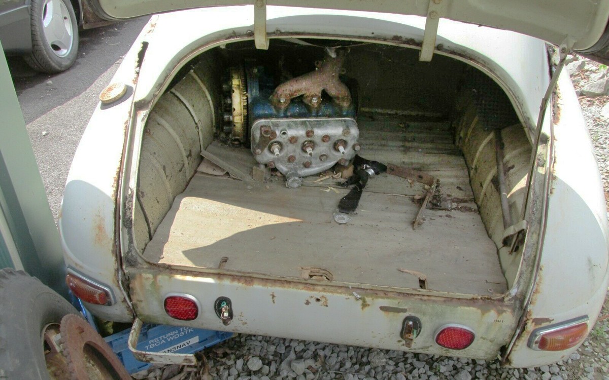 Nsuracer, the 1955-57 Saab 93 had a split windshield but the ’58 93B had a one-piece windshield, according to the info I saw online. Thanks for the information on the 850 engine in the trunk, good eye!