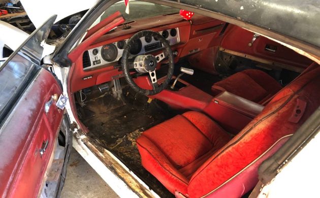 There is no sugar coating this. Both of these cars need a lot of work. Both cars have engines but it is not stated whether they are original or numbers matching. At this point, a rebuild and amalgamation of the two cars is probably the only path forward. In 1977, Pontiac Trans Am offered three engines: the base Pontiac L78 400 V8 (180 hp, 325 lb-ft), the Oldsmobile L80 403 V8 (185 hp, 320 lb-ft) for California and high altitudes—only with automatic transmission—and the performance oriented Pontiac W72 400 V8 (200 hp, 325 lb-ft), identifiable by chrome valve covers and 6X heads. There are not pictures of the engines in the ad but it is possible that the white car is a W72 optioned Trans Am since it has a 4 speed.