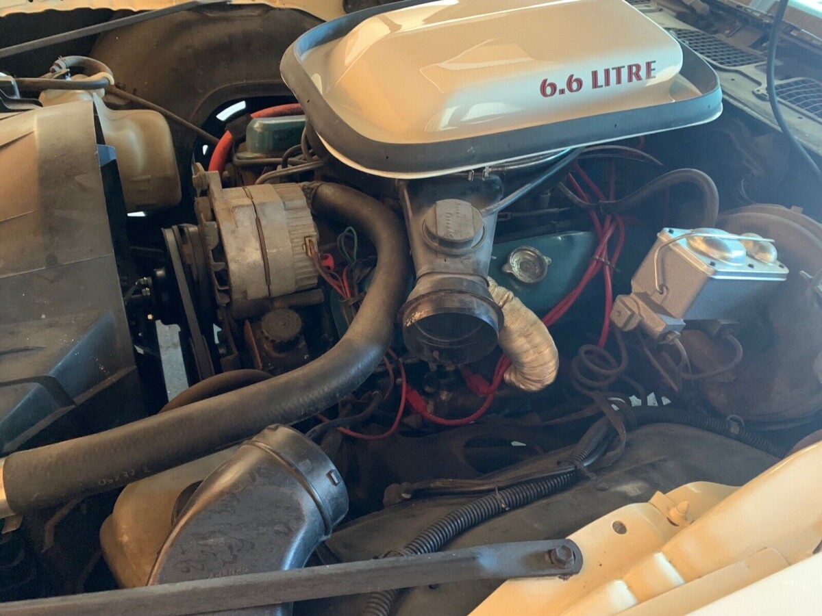 In 1977, 49 states featured the L78 400 cubic inch V8 engine as their base engine, which was rated at 180 horsepower. For California, the base engine was the L80 403 cubic inch V8 Oldsmobile engine producing 185 horsepower. For those seeking performance, the W72 400 cubic inch V8 engine was the option, factory rated at 200 horsepower. This engine was equipped with an 800 cfm 4 barrel Rochester carburetor, high capacity 60 psi oil pump, special cam, baffled oil pan, special piston rings and 6X heads with 8:1 compression. Based on the engine pics in the ad, this car appears to be equipped with the base L78 400 cubic inch V8 engine.