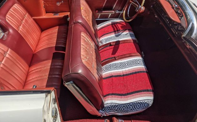To me, Pontiac had the most colorful, visually-appealing interiors on their flagship Bonneville line. The multi-toned leather seats, door panels, and the right balance of chrome, color, woodgrain trim, and tasteful instrument panel styling made for one impressive cockpit. As to be expected in an original, sixty-one year old convertible, there is some visible fading and front seat wear. The front leather bench seat (sporty bucket seats with a console were also available as an option) is showing its age as there are some cracks visible on the seat backs. I’m assuming the color-coordinated blanket on the front seat bottom is there to cover up some leather “imperfections.”