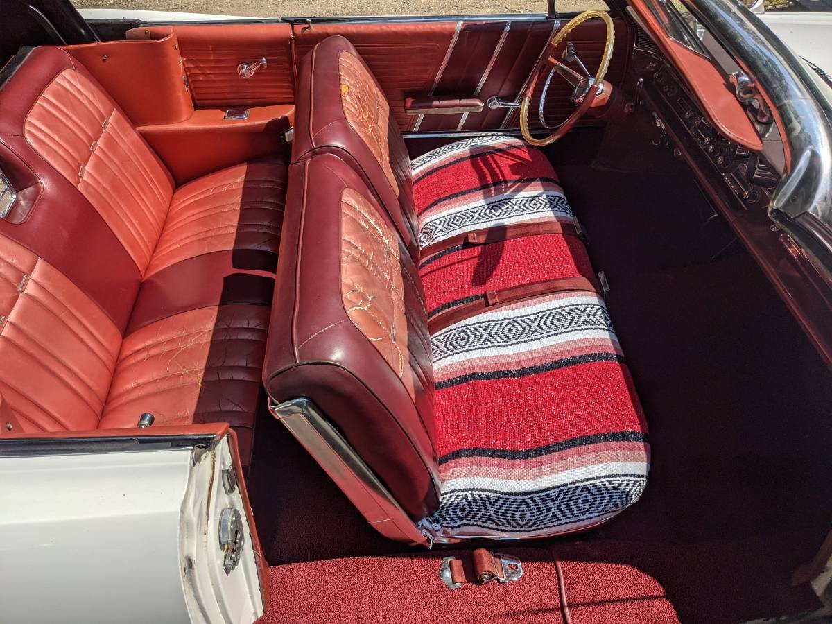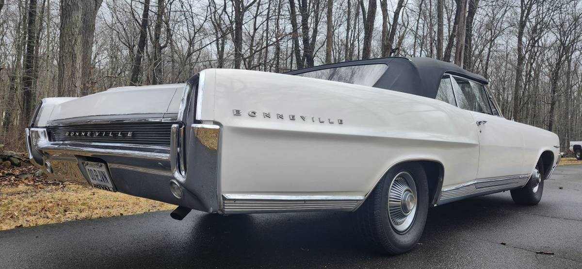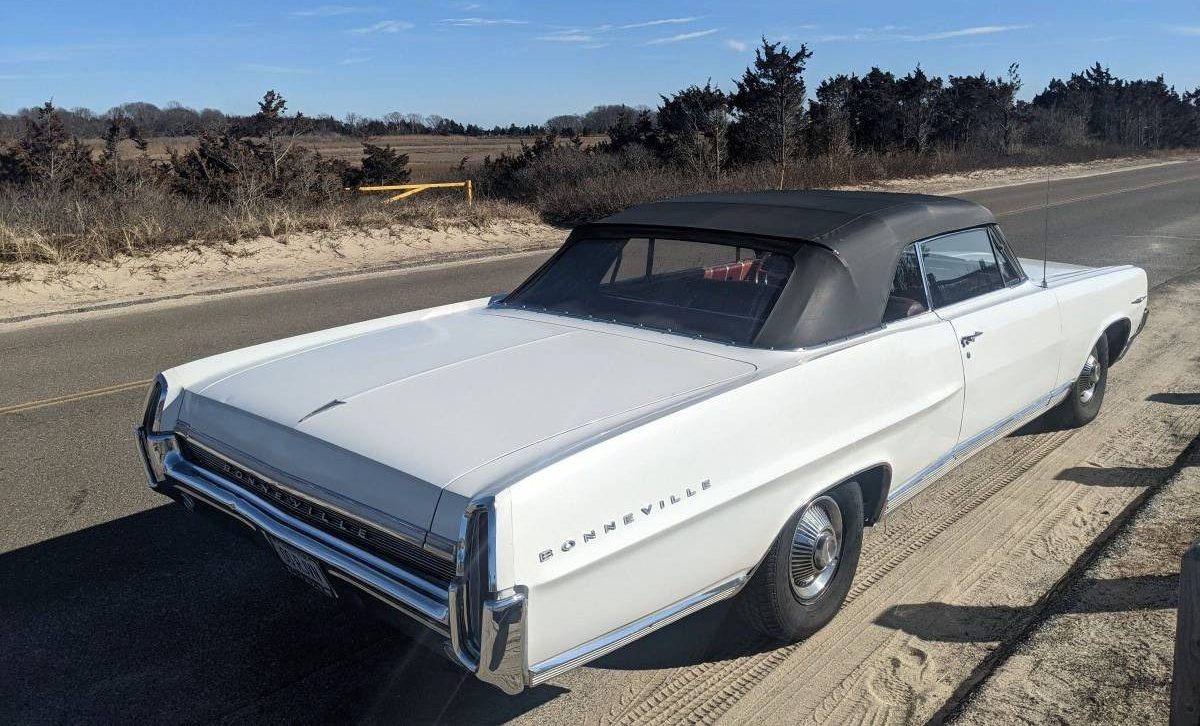 The seller purchased the car a few years ago from the original owner’s family. It’s been taken care of and garaged given its overall condition and is a great example of a well kept, driver-quality convertible (one of 22,016 top-of-the-line ’64 Bonneville Convertibles produced). The original Code C Cameo White paint looks presentable and shows off the Pontiac’s tasteful styling and trim. Split grilles, Wide-Track, and performance were still a winning formula for Pontiac which saw strong sales keep them again in third place. The stacked headlights continue from the ’63 restyling and the rear end now features those distinctive “boomerang” taillights which I always thought were cool. I’m not spotting any rust or body dents and bruises, and the chrome, glass, Bonneville badging, and black convertible top all look good.