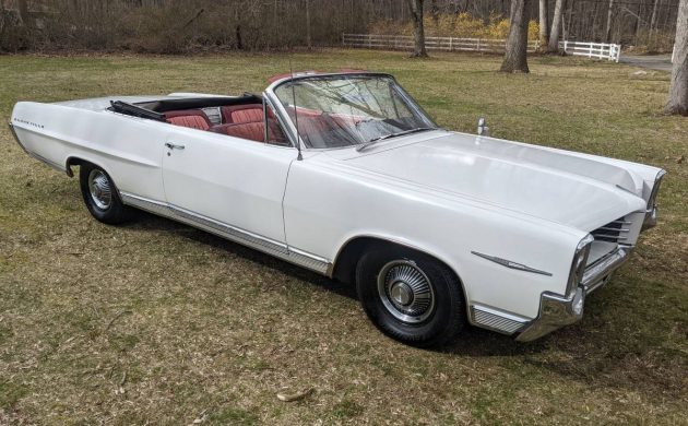 Under the Bonnie’s bonnet is a 389-cubic inch, 303-horsepower Trophy V8 that’s mated to a Hydra-Matic automatic transmission. The mileage on the odometer shows 91,546 which I’m assuming is the car’s original mileage. The seller shares that mechanically, the Poncho runs, drives, and stops very well. The gas tank has been flushed, the original Carter carb rebuilt, and a new fuel pump and aluminum radiator have been installed. As a bonus, the cars build sheet is included and shows that this Pontiac was built for summertime fun in July of 1964 at GM’s Linden, New Jersey plant. This nice old Pontiac calls Madison, Connecticut home and is currently listed for sale here on craigslist for $11,500. I’m a softy for bone stock, driver-quality “survivors” like this one. Pontiac was on top of their game in 1964. This attractive full-size Bonneville Convertible shows why.