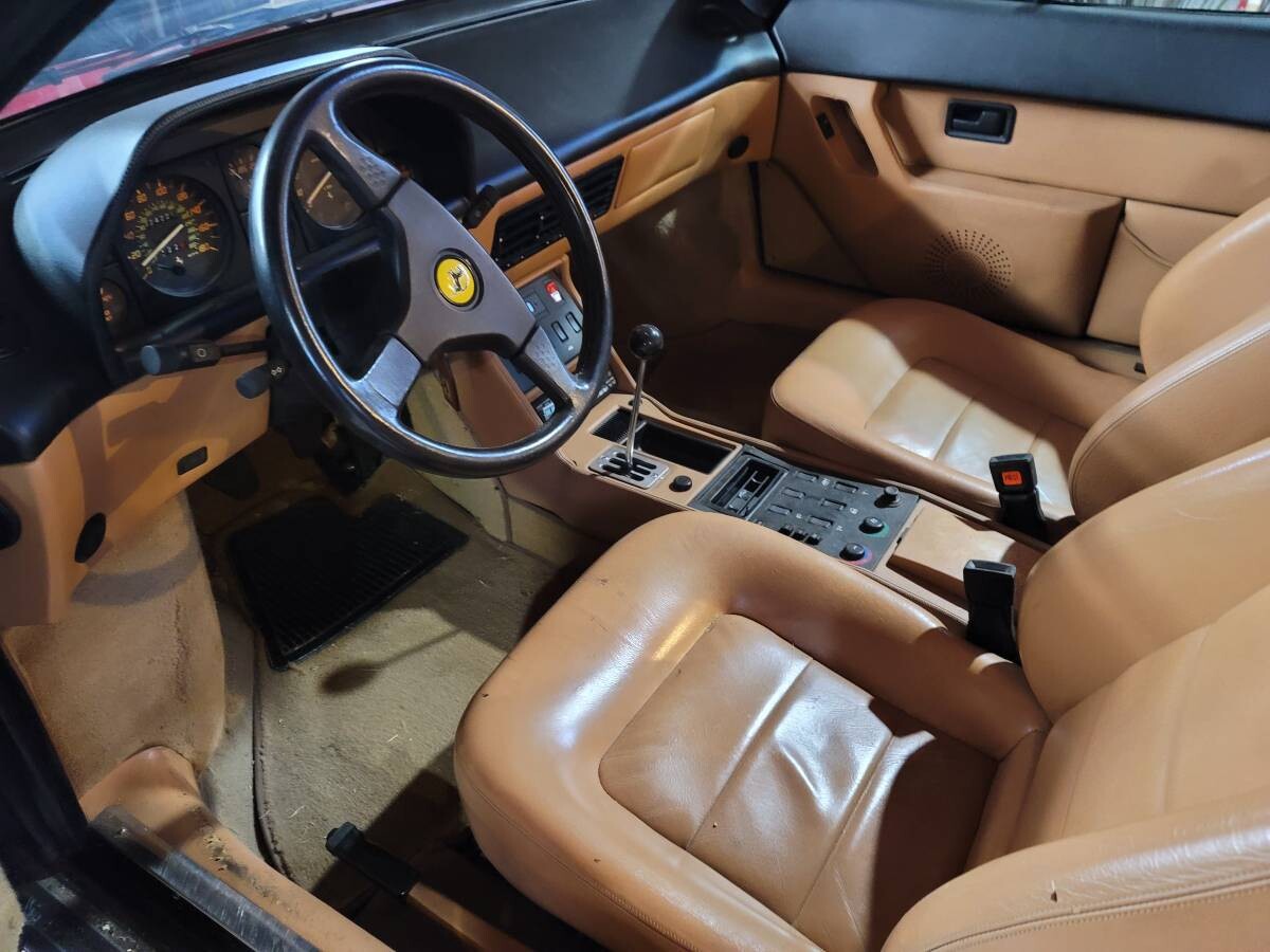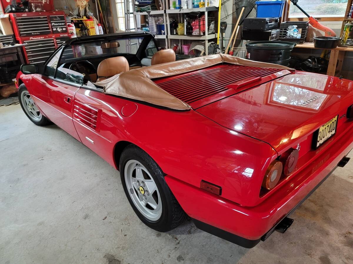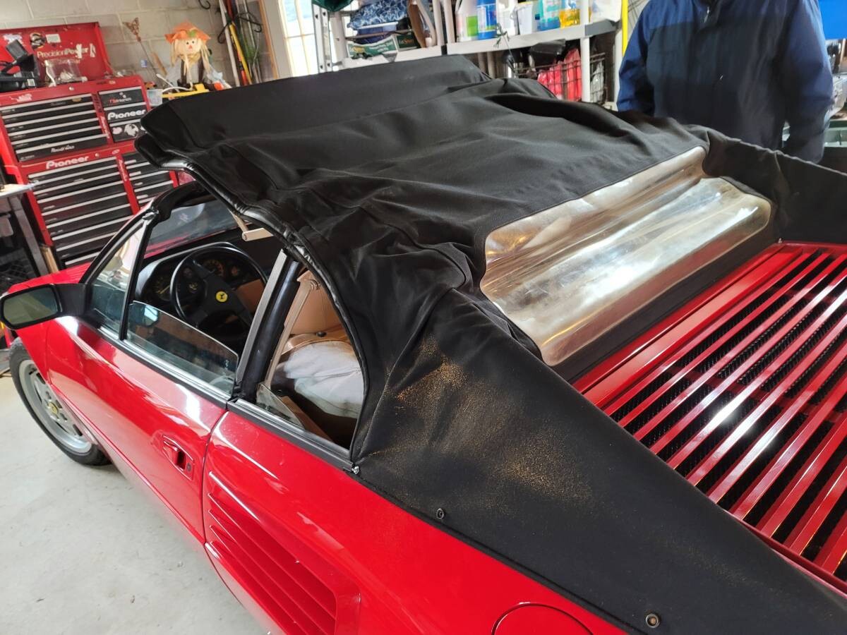 The Mondial T is powered by the best engine provided to any of the four series – a 3.4 liter V8 with fuel delivery courtesy of a Bosch Motronic injection system. Good for 300 hp and a zero to sixty time in under six seconds, this Mondial is finally feeling like a Ferrari. Of course, there’s a catch. In the earlier cars, the engine was mounted transversely, but in the T, the engine was mounted longitudinally with the five-speed gearbox mounted transversely, making a “t”. While the new layout improved the car’s center of gravity, it nearly guarantees that pulling the engine is the only way to perform the belt service. This owner managed to leave the motor in situ, but the process does not sound easy. Our seller did not provide engine photos, unfortunately, but it’s under that louvered lid. What we do see in this photo is the convertible top, with a yellowed rear window and some discoloring in the fabric. Caveat emptor: these tops don’t always work right.