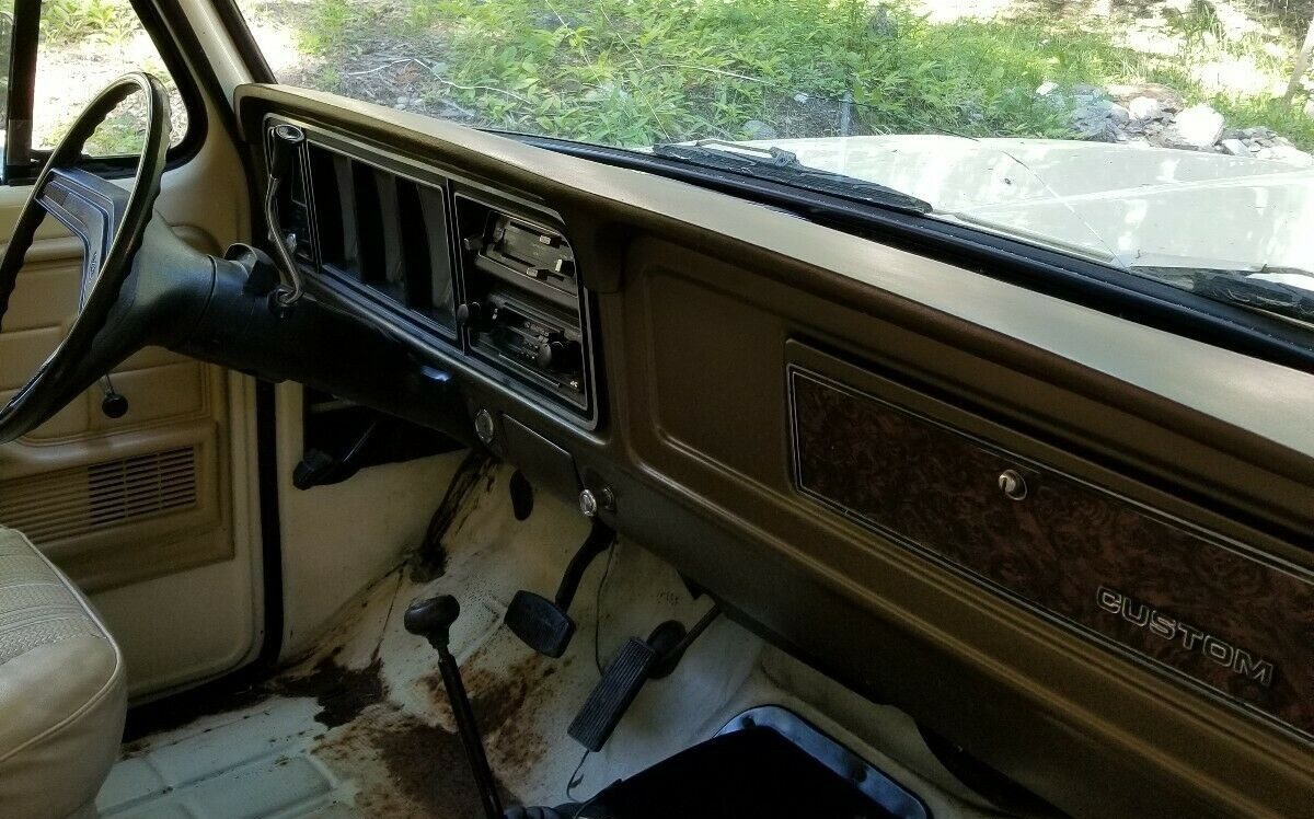 The interior looks original as well, floor coverings have been removed exposing some rust forming on the floors. The seats could use recovering but the dash looks great. The Custom was the entry trim level for 1979 so few options are present. This truck has an aftermarket radio and no A/C. The second-generation Bronco was based on the F series pickup, a view of the front passenger compartment makes it hard to tell the two apart. Behind the front seats is a different story with a rear seat and a removable hardtop. We can see shifters for the C6 Auto Transmission, and 4WD shifter for the NP205 transfer case, both are in good working order. Mileage is listed as 144K.