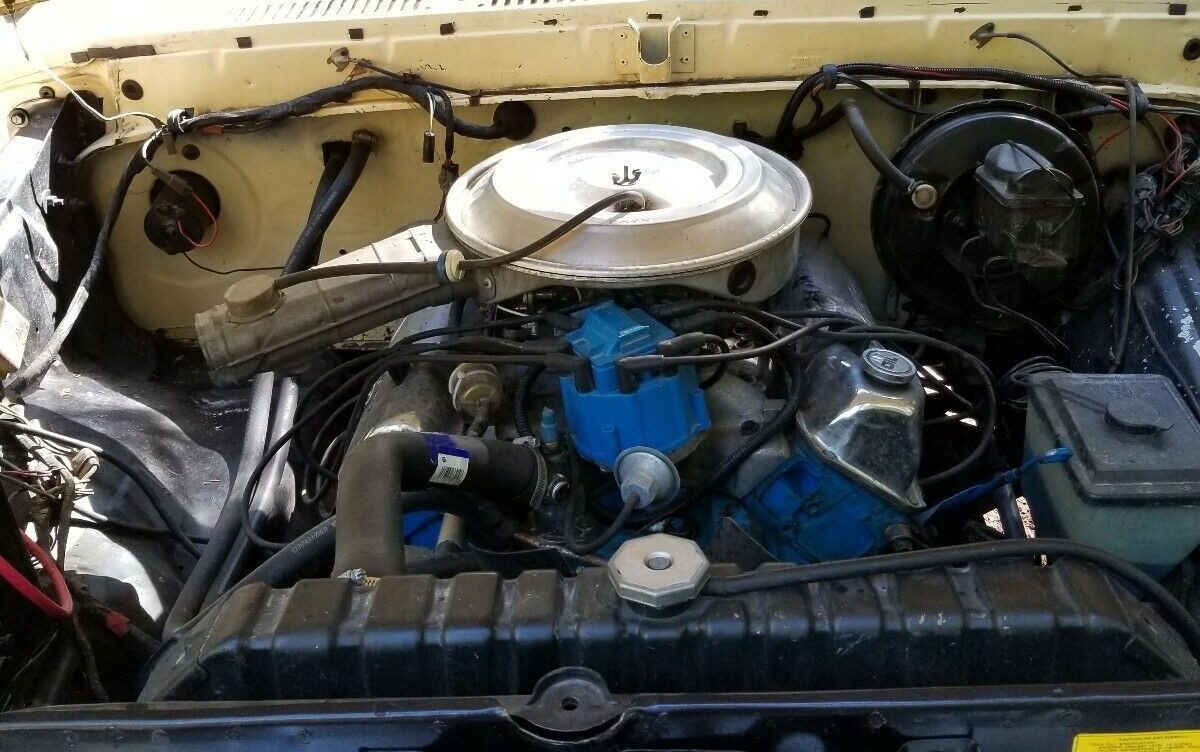 The original 351M was pulled at some point and replaced with a rebuilt 400M. Upgrades include a Carter AFB carb, Weiand intake manifold, and a GM style HEI distributor. A tuneup has recently been done and the 400 runs good with lots of power, in fact, the seller describes the truck as “exciting/scary to drive above 40 with new built engine and worn out front end”. Other items needing attention are a cracked windshield and rusted out exhaust system. This Bronco needs some work but not anything that cant be handled in the driveway or garage over a few weekends. I love the color combination, hopefully, this one will get sorted out mechanically by the new owner and kept original wherever possible.