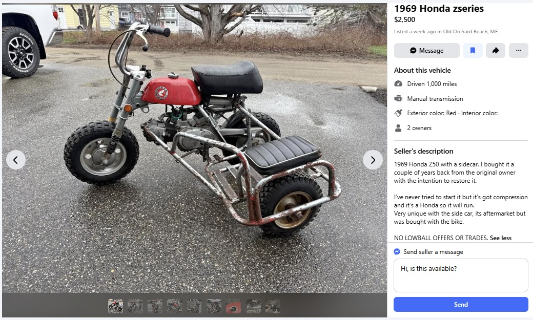 I’m not sure if the founders of the World Sidecar Championship had a Honda 50 in mind when they started their organization in 1949. Yeah, let’s just say they didn’t. This 1969 Honda Z50A K1 with sidecar is listed here on Facebook Marketplace in Old Orchard Beach, Maine, and they’re asking $2,500. Former Barn Finds writer Jay B. sent me a heads-up on this tip. Thanks, Jay! Here is the original listing in case some tall, skinny lunkhead grabs it.