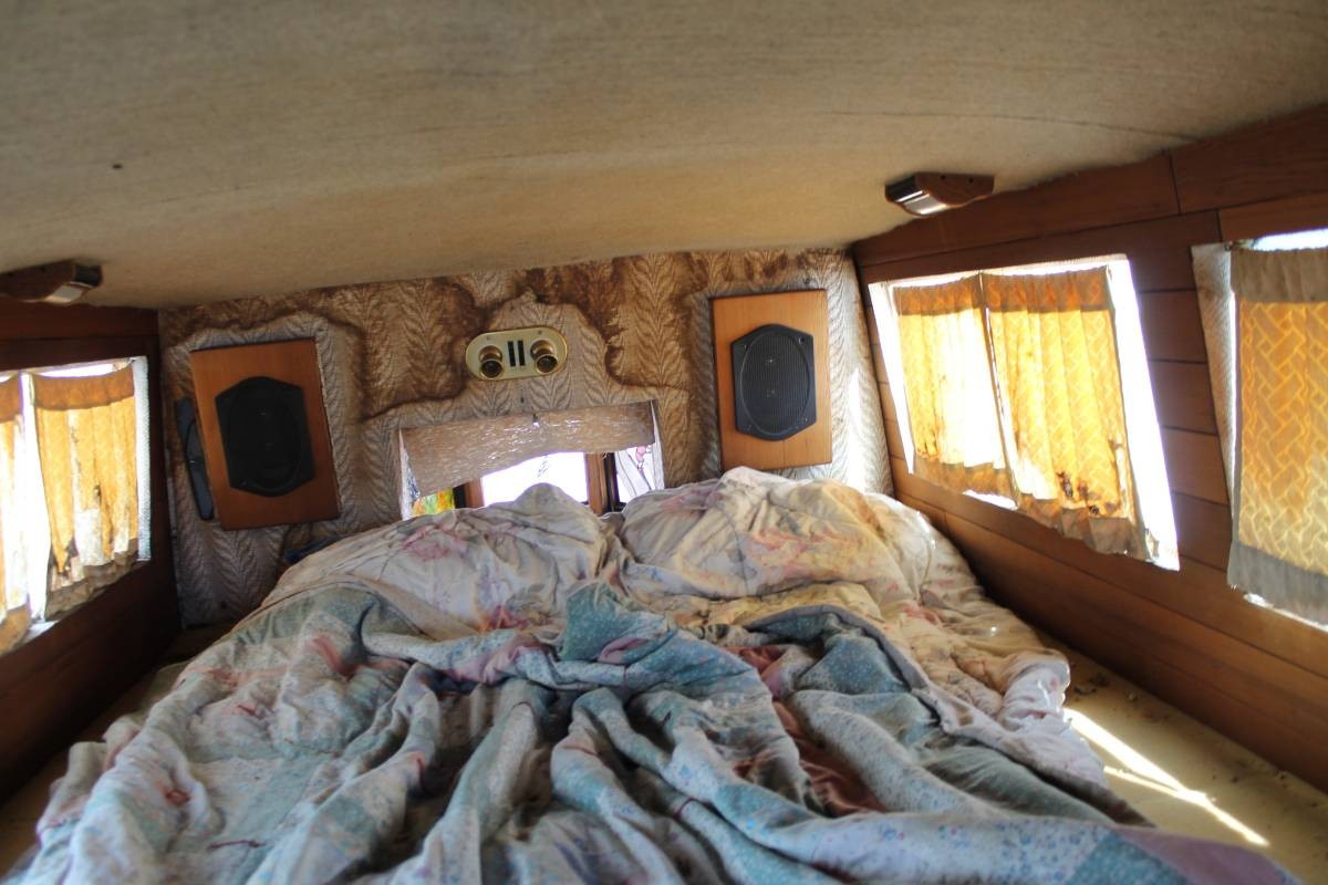 There’s the former interior of the Dodge, now featuring wood paneling and a book shelf. I’m having a hard time determining if this thing looks better than I expected, or it’s just looks that way because the outside is so jarring. Now, the seller does say it features “fine craftmanship,” and I don’t think he’s using those words in jest. It could look like an entirely different vehicle if the paint was freshened up, but I’d rather have a custom RV like this with a clean cabin and faded paint than a beautiful exterior and a former homeless encampment inside. Photos show a kitchen, shower, writing desk, sleeping quarters, and more.