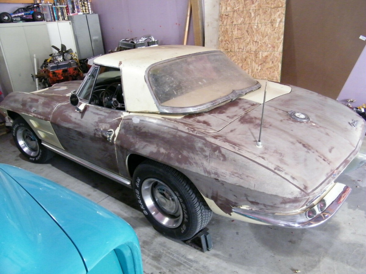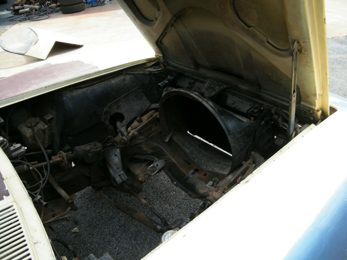 The interior is a definite bright spot, especially for a convertible which oftentimes has a completely roached out cabin if it’s been used as nature intended and left with the top down for weeks at a time, the sunlight pounding in. The original steering wheel is mildly bus-like in size, but that’s part of the charm of owning a muscle car from this era. The yellow-on-black combo is a sharp look for a Corvette of this era, and the cabin looks largely intact despite the gaping hole where the transmission used to be. The seller reports that the carpets and door panels are in good shape, and that the original radio is still present. All gauges are accounted for and still work, even the tachometer – which doesn’t have much significance in a car with no engine.