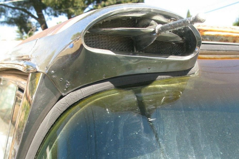 Mercury equipped the Turnpike Cruiser with some quirky design features, and this is undoubtedly my favorite. Mercury fitted cold-air intakes at the top of the tinted windshield on either side. This fed cool air to vents located directly behind, and when coupled with the “Breezeway” retractable rear window, provided excellent flow-through ventilation. This system is complete, although the external fittings for the vents are showing some bubbling. If the car is going to be restored, these should look good following a trip to the platers.