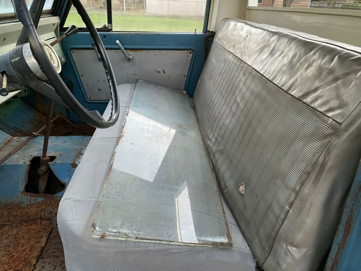 The interior is spartan and has a panel of glass sitting across the front bench seat. This U14 Half cab came with a blue and white interior with a silver seat, according to the seller. This is the first year of Bronco production and is said to be a rare version of the 4WD Ford Bronco. The main rust areas on this little vehicle are in the interior floors. The rear bed is also rusted through and is covered by a pallet holding a spare 6 cylinder engine.