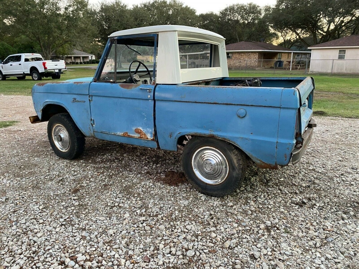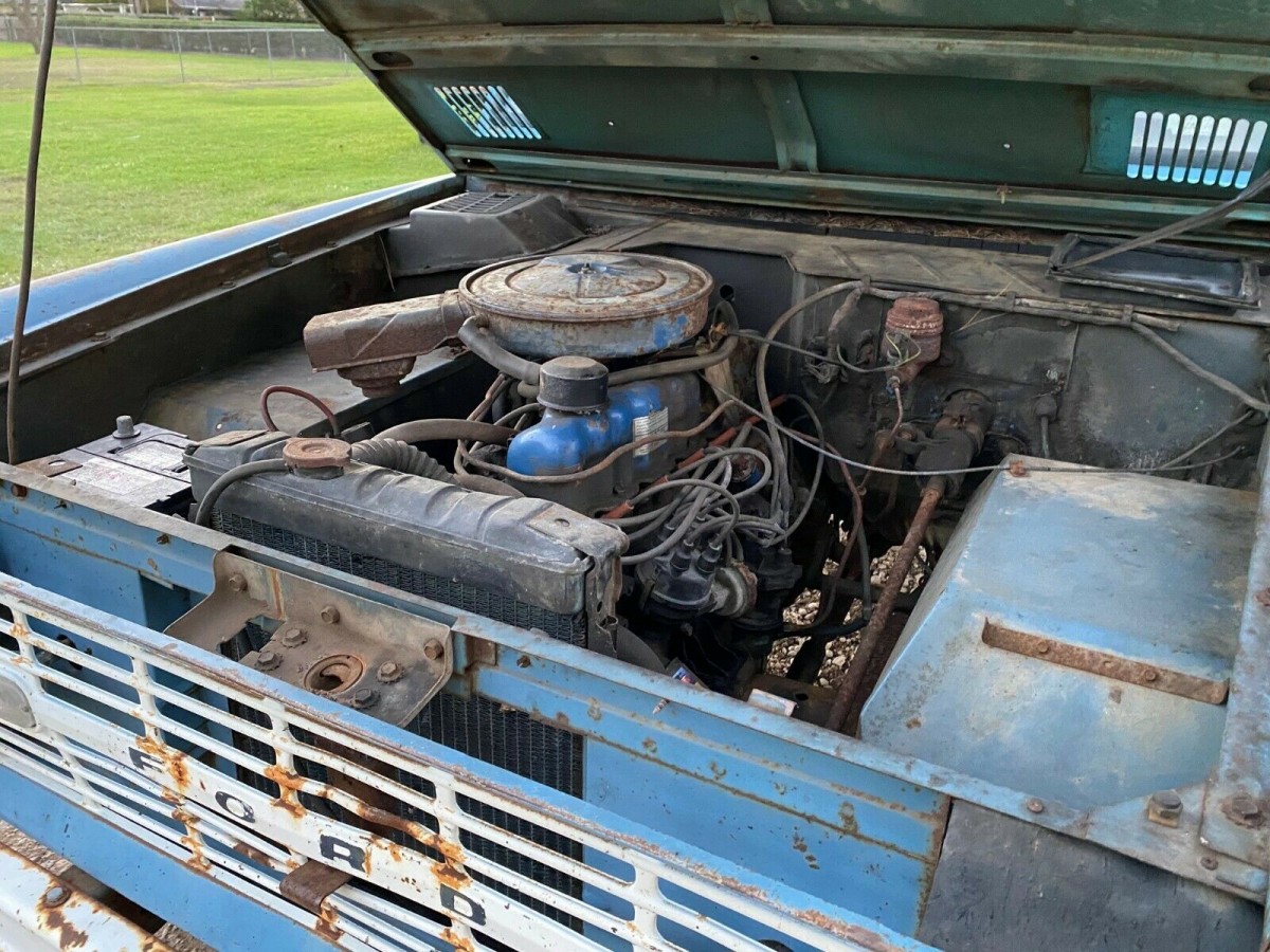 The Bronco is equipped with a 170 cubic inch inline 6 cylinder engine that was rated at 105 horsepower. The engine is backed by a column shifted 3-speed manual transmission. The vehicle is equipped with a 4:11 geared rear end and the engine is said to be numbers matching. The hubcaps on all four wheels are said to be original. The Bronco was built on a 92-inch wheel base and was only 152 inches long.
