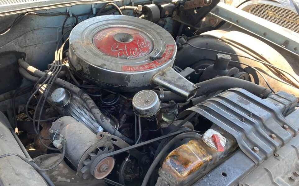 Claimed to “Run and Stop” this Starfire is powered by a 345 gross HP 394 CI, V8 engine backed up by a Hydramatic automatic transmission. My assumption is that the valve covers are non-original but the “Ultra High Compression” (10.5:1) air cleaner dates to day one. Of note is a replacement power brake booster and master cylinder.