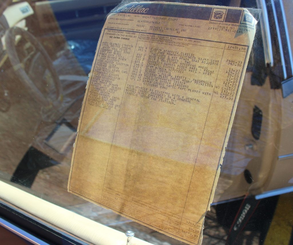 These cars had a window sticker price of $16,220. I bought a new Thunderbird in 1978 that listed for $8,222, so this guy basically paid about four times for these two cars that I paid for my one, a lot of money back in those days. The Custom Biarritz Classic package alone was an extra $2,466. I’m surprised to not see the color of the cars on the window sticker. The color is Colonial Yellow and when the cars were sent out to get the sunroofs installed, the Rudiso Saddle Metallic was added to the hood for a two-tone finish. The cars were purchased from Mathews Cadillac in Dearborn, Michigan.