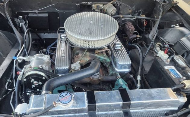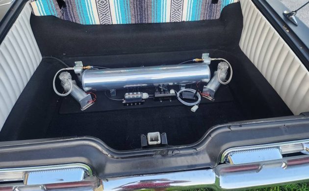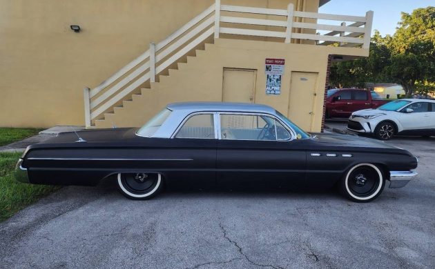 Buick’s big car line-up for ’62 placed the LeSabre at the bottom of the hierarchy, and then slotted the Invicta in between it and the top-drawer Electra 225. LeSabre’s body styles included two and four-door sedans as well as two and four-door hardtops. Our subject is one of 7,400 copies out of a total of 127K LeSabres that left the Flint assembly line in ’62. Not surprisingly, the four-door sedan (56K units) was the top-selling LeSabre body style. The styling cue that really caught my attention is this Buick’s C-pillar; it’s the same Fisher Body design employed on similar era Oldsmobiles, Pontiacs, and Chevrolets. The seller’s listing is parismonious in detail, so the images do the talkin’. We have a straight body, a custom grille, and shaved door handles, all while wearing a satin black primer finish and a contrasting painted roof. The stainless trim, not too extensive on a LeSabre two-door sedan, has been retained – including the portholes. The wheels appear to be painted steelies, and the wider white wall tires give this Buick a period look. If you think this rig is riding low, you’re right; it has air suspension.