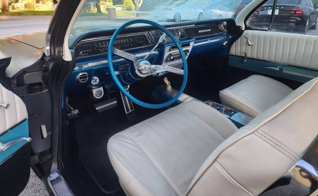 All ’62 LeSabres came equipped with a 401 CI V8 engine generating 280 gross HP. Options included a downgraded, regular gas 265 HP version or a full zoot-suit, 325 HP powerplant – which one we have here is not disclosed. This motor has, however, been treated to finned alloy valve covers, an open-element air cleaner, and cooling courtesy of an aluminum radiator. The rear-wheel connection is made via a Dual Path Turbine Drive automatic transmission.
