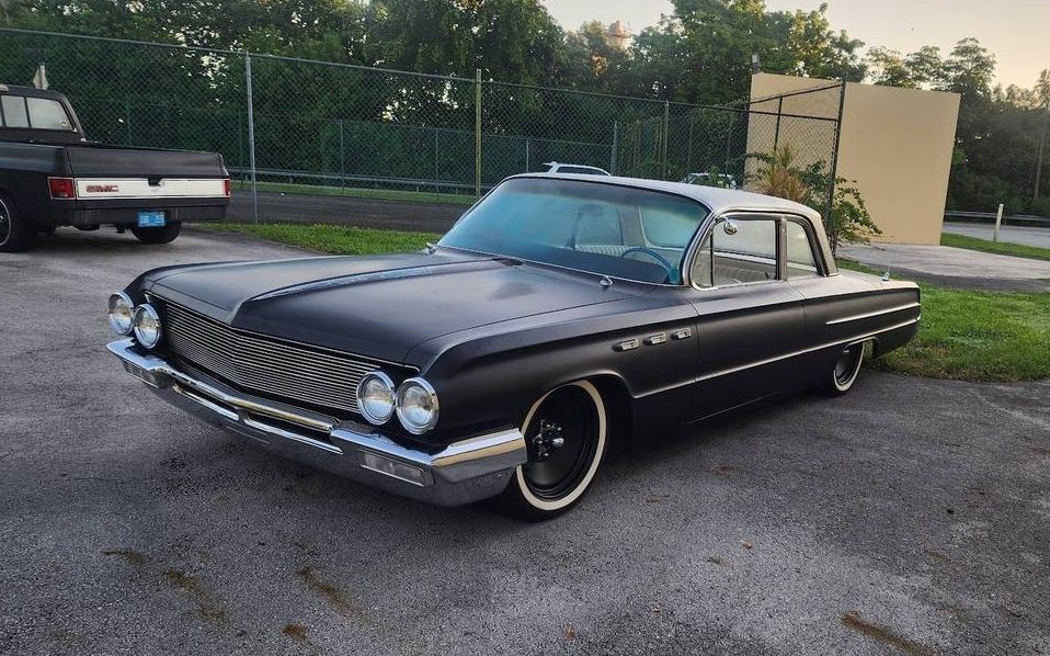 Buick’s big car line-up for ’62 placed the LeSabre at the bottom of the hierarchy, and then slotted the Invicta in between it and the top-drawer Electra 225. LeSabre’s body styles included two and four-door sedans as well as two and four-door hardtops. Our subject is one of 7,400 copies out of a total of 127K LeSabres that left the Flint assembly line in ’62. Not surprisingly, the four-door sedan (56K units) was the top-selling LeSabre body style. The styling cue that really caught my attention is this Buick’s C-pillar; it’s the same Fisher Body design employed on similar era Oldsmobiles, Pontiacs, and Chevrolets. The seller’s listing is parismonious in detail, so the images do the talkin’. We have a straight body, a custom grille, and shaved door handles, all while wearing a satin black primer finish and a contrasting painted roof. The stainless trim, not too extensive on a LeSabre two-door sedan, has been retained – including the portholes. The wheels appear to be painted steelies, and the wider white wall tires give this Buick a period look. If you think this rig is riding low, you’re right; it has air suspension.