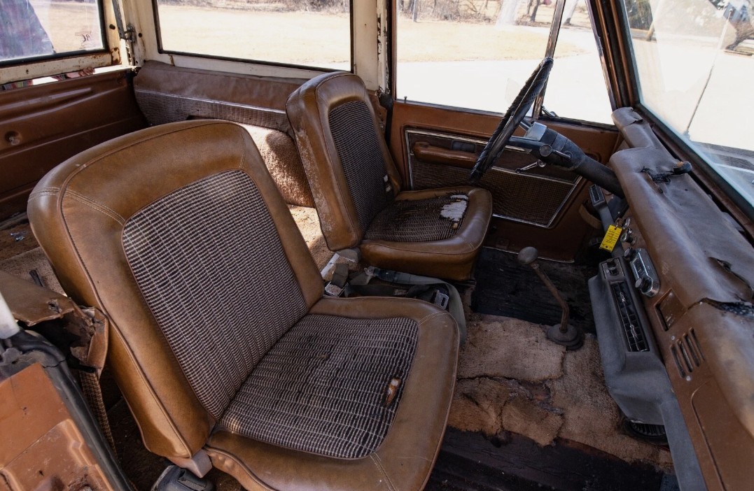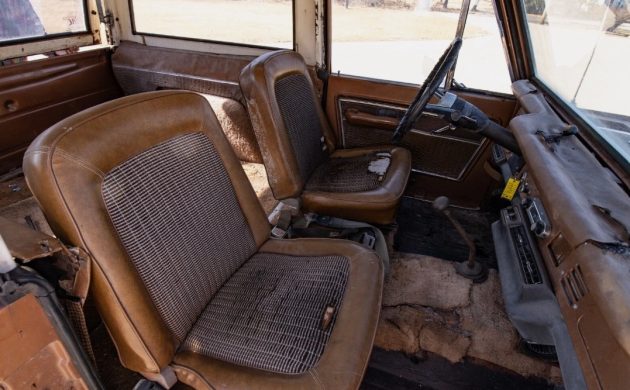 The interior has been ravaged by sun and humidity. I’ve never seen a dash quite this badly damaged. The seat fabric is emblematic of the Ranger trim package, with those jazzy inserts. Both the fronts are torn however. Only the underlayment remains of the floor covering – a hint that we may be looking at a formerly wet vehicle. This ’73 was optioned with power steering; the seller mentions air conditioning but that wasn’t offered until 1978 so it would be a dealer-installed unit.