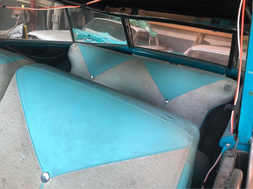 Having owned a ’56 in these colors, the turquois is not quite right, maybe a repaint. Chevy had two versions of this color in ’56, enamel, and laquer, the laquer was darker or richer, and cost more. If you special ordered, you could get what you wanted, and probably this being an expensive car for Chevy it came with the laquer. OR,it could just be the color rendtition of the photography, but it just does not look right. The interior looks right for a BelAire