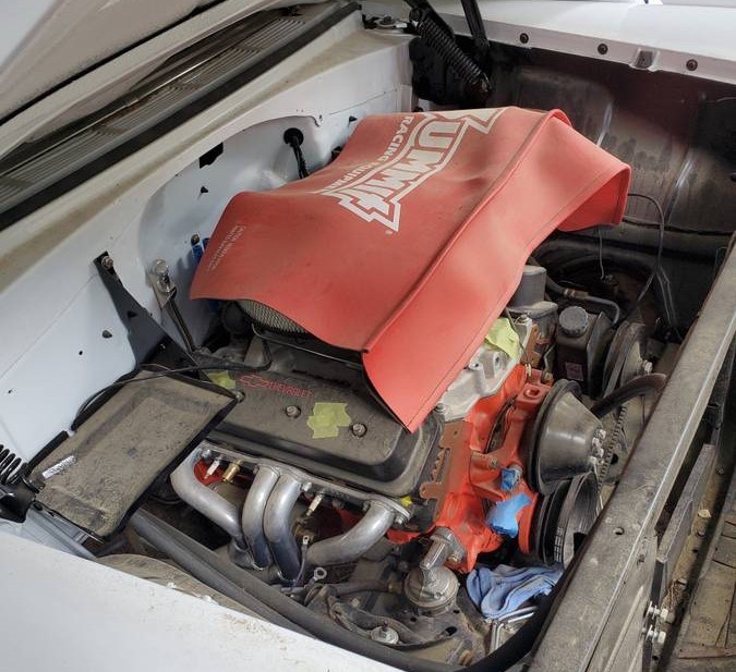 A rebuilt 350 cubic inch V8 is under the hood and a 700r automatic transmission with paperwork is also present, so this is not a numbers-matching project. It’s not running and we don’t know how close it is to performing. The 210 has power steering and front disc brakes, the latter was not available in 1956. New glass has been installed, but the interior is practically stripped to paint. There are custom upholstered seats waiting to be installed, but they don’t quite look right with the rest of the colors. Spare parts will accompany the sale.