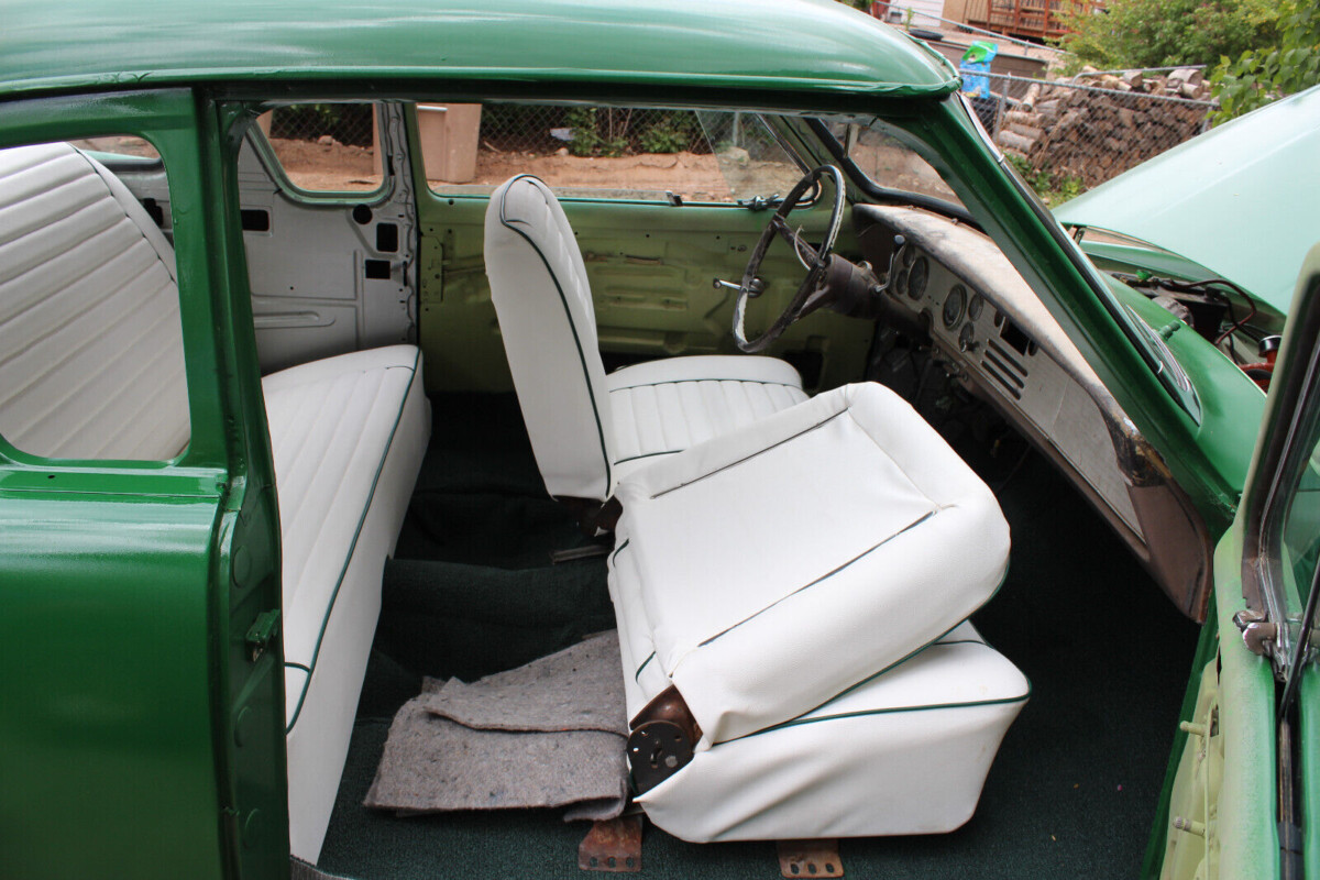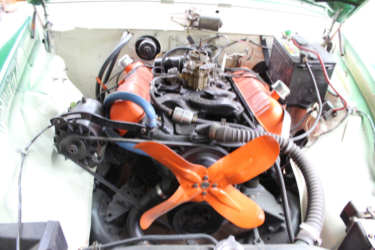 Whatever rust or other issues the body may have had look to have been handled prior to new green and white paint being applied (I’m not sure that shade of green was a standard color). Brightwork may need re-chroming before being reinstalled. The interior looks about ready with new seats and carpeting, but the door panels may still be on the to-do list. And the V8 engine, likely a 289, is said to run although it looks only to be positioned in the engine compartment.