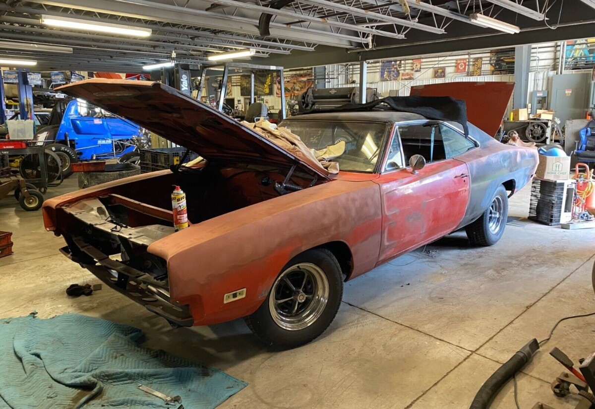 The second-generation Charger (1968-70) was popularized by at least two Hollywood productions. Who could forget the famous car chase in the movie Bullitt where a ’68 Charger RT was a principal player. Then there was its starring role in the TV series The Dukes of Hazzard where the Hemi Orange ’69 General Lee was always being pursued by the law. This 1969 Dodge Charger is said to have worn that color of paint, though we’re unsure and no cowl tag is available to verify it. While the photos don’t confirm it, the seller says that all its parts have been “gathered up”.