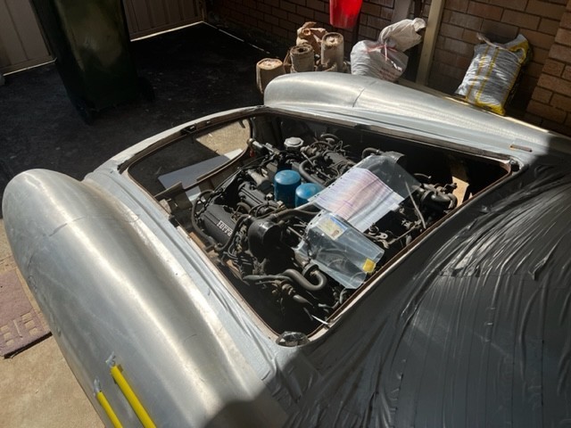 Quite a bit of work has already been done to attach the body panels and install the engine. The engine is said to have good compression and comes with a starter motor. A 5-speed manual that goes with this 400GT engine is included but it doesn’t sound like it’s been installed. Some other major parts are included but others are not; for instance, there is no steering box but it will come with all arms springs, shocks, and hubs, and rides on new tires that are mounted on “dummy” steel wheels to determine final offsets before building a set of custom wire wheels that match what the original 250 came with. Still, as you can see – even with all the work done – there is much more yet to do.