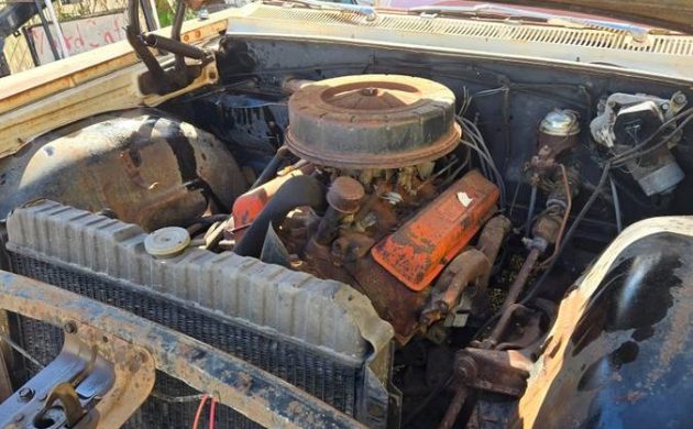 The car has a 327 cubic inch V8 which hasn’t run in an unspecified amount of time. It may be paired with Chevy’s venerable 2-speed Powerglide automatic transmission. The odometer is said to have rolled over, so how much road time that either have seen isn’t known. While the doors aren’t shown, they’re there somewhere though the inside panels are MIA. Other missing pieces include the windshield, radio, and ignition set-up.