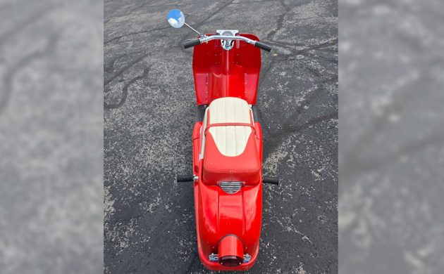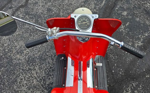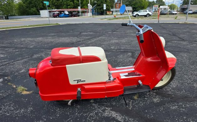 Pepper Red was one of three new colors for 1961 on Harley’s unique scooter, and they all had contrasting Birch White, no matter if you chose this color, Strato Blue, or Granada Green. This 1961 Harley-Davidson Topper can be found here on Facebook Marketplace in Van Wert, Ohio, and they’re asking $6,000. Here is the original listing, and thanks to Sam61 for the Topper tip!